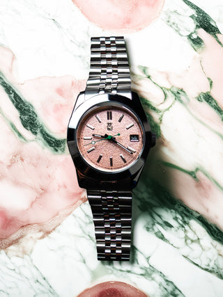 It is a very cool combination of colors. The case and the bracelet are excellent. My one small quibble would be with legibility of a pink dial and basically white markers. Maybe a small line of black in the center of each might make it more legible in medium. I also think the logo could stand to be bigger. The size it is now it gets mistaken for the hour hand. But I love my purchase nonetheless.