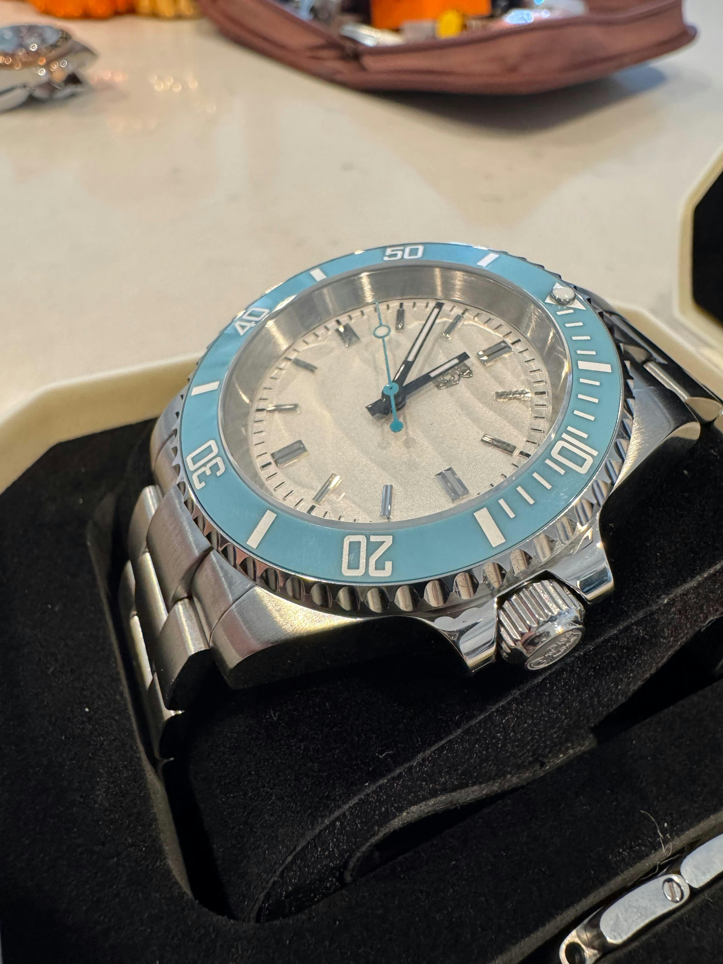 Received my custom build watch two days ago and havent taken it off yet. Just like my first watch it is awesome the colors are great matt even made me a custom dial i wanted it to look like a pepsi with a white dial and it is awesome im looking forward to my third one. Ive done the other mod companies and they just dont feel like quality but these watches are awesome as soon as i got my first one i ordered my second.