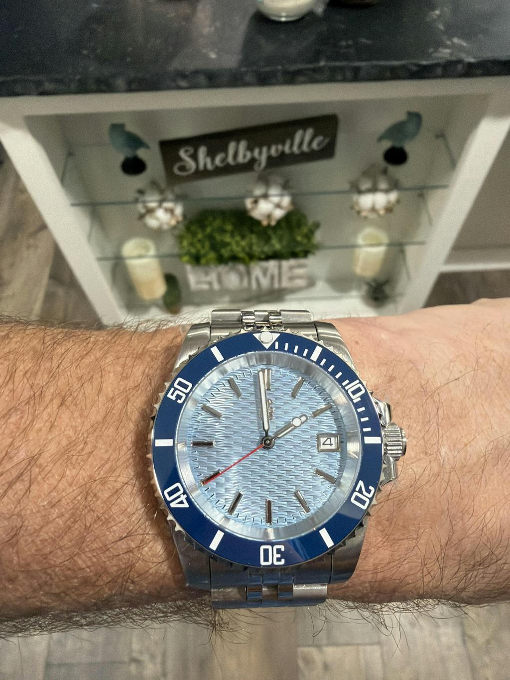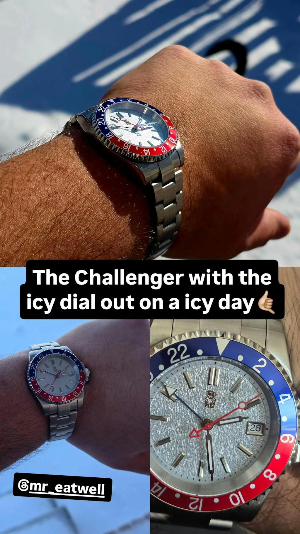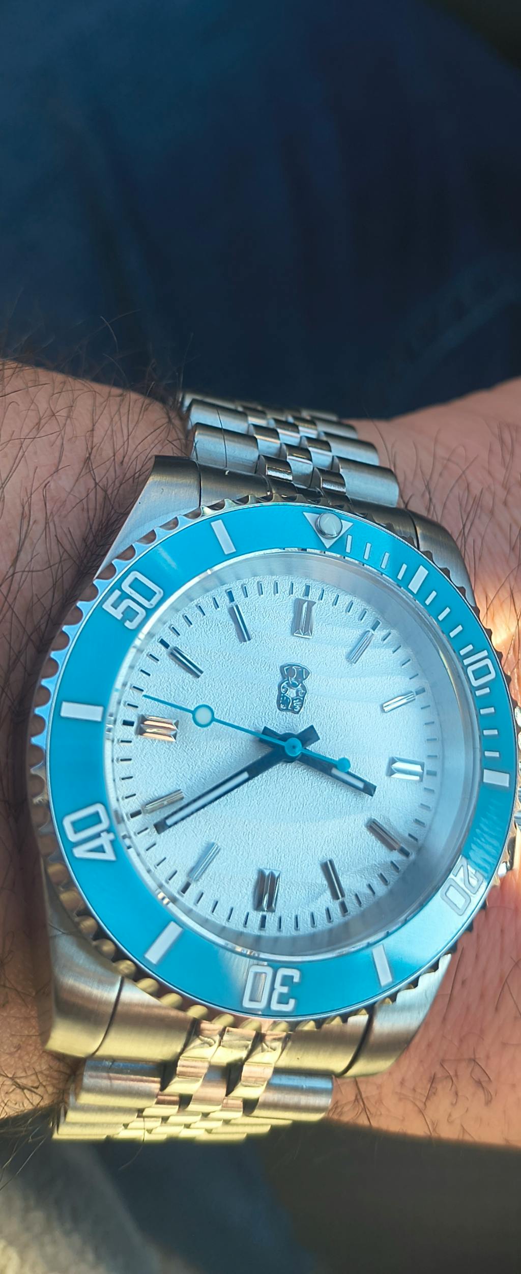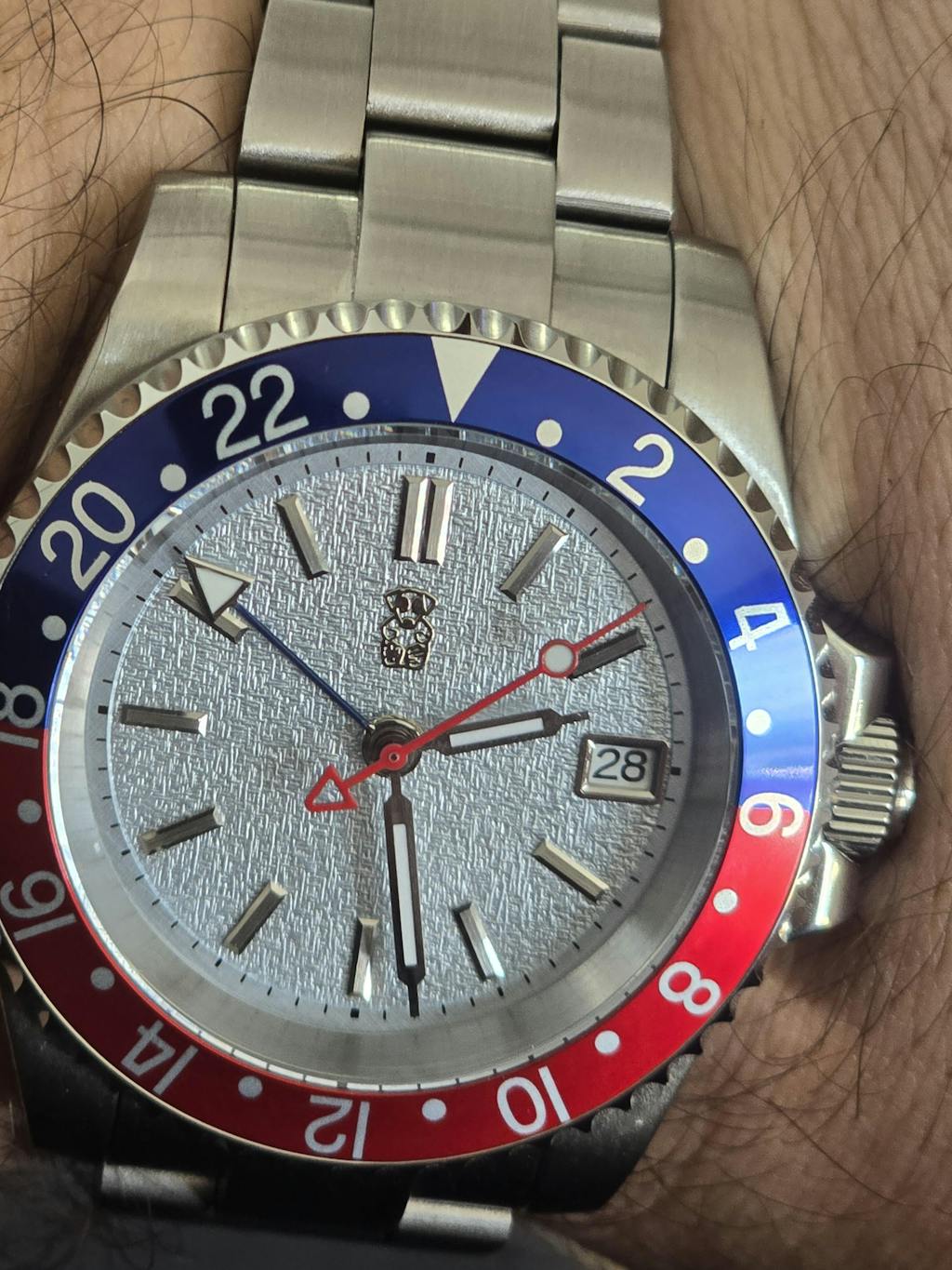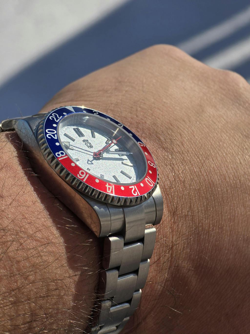 This is the watch that caught my eye for this brand while scrolling IG. Absolutely stunning, always wanted a "Pepsi bezel" watch and this one also checked the GMT box so two birds, one stone. The icy dial looks awesome out in the sun! Bezel turns and clicks like a much more expensive watch. Did have an initial issue with the GMT function but Matt and his team got it squared away asap, the customer service is top tier. Bracelets finish isn't the best, edges are sharp but overall extremely happy! ALWAYS support small business when possible!