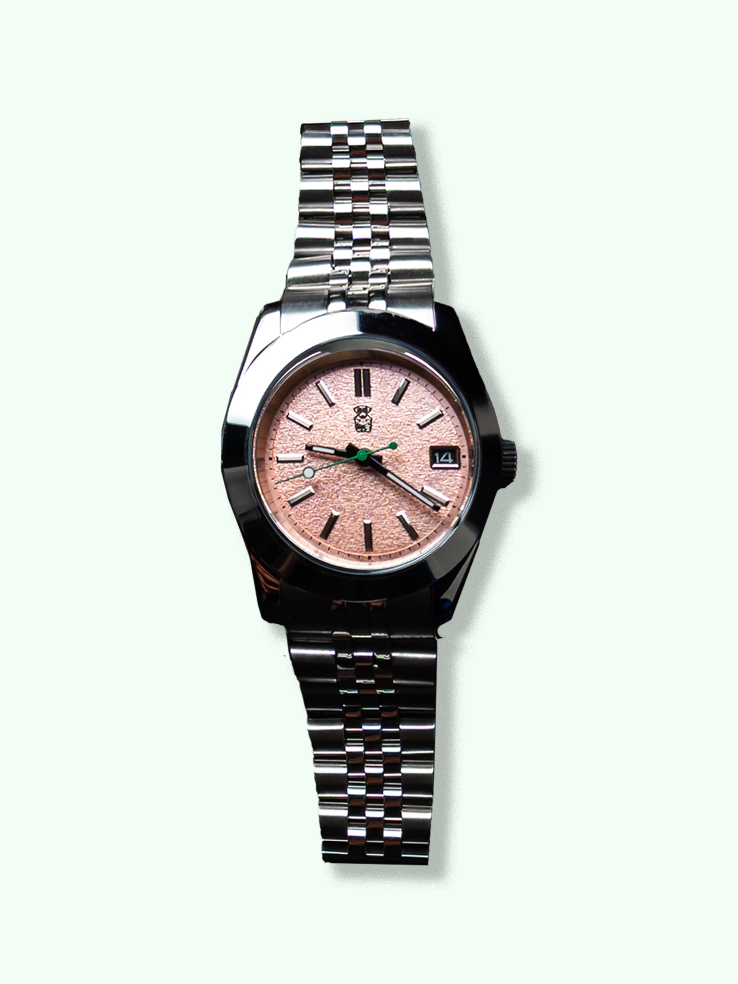 - Frosted pink dial with subtle crystalline texture